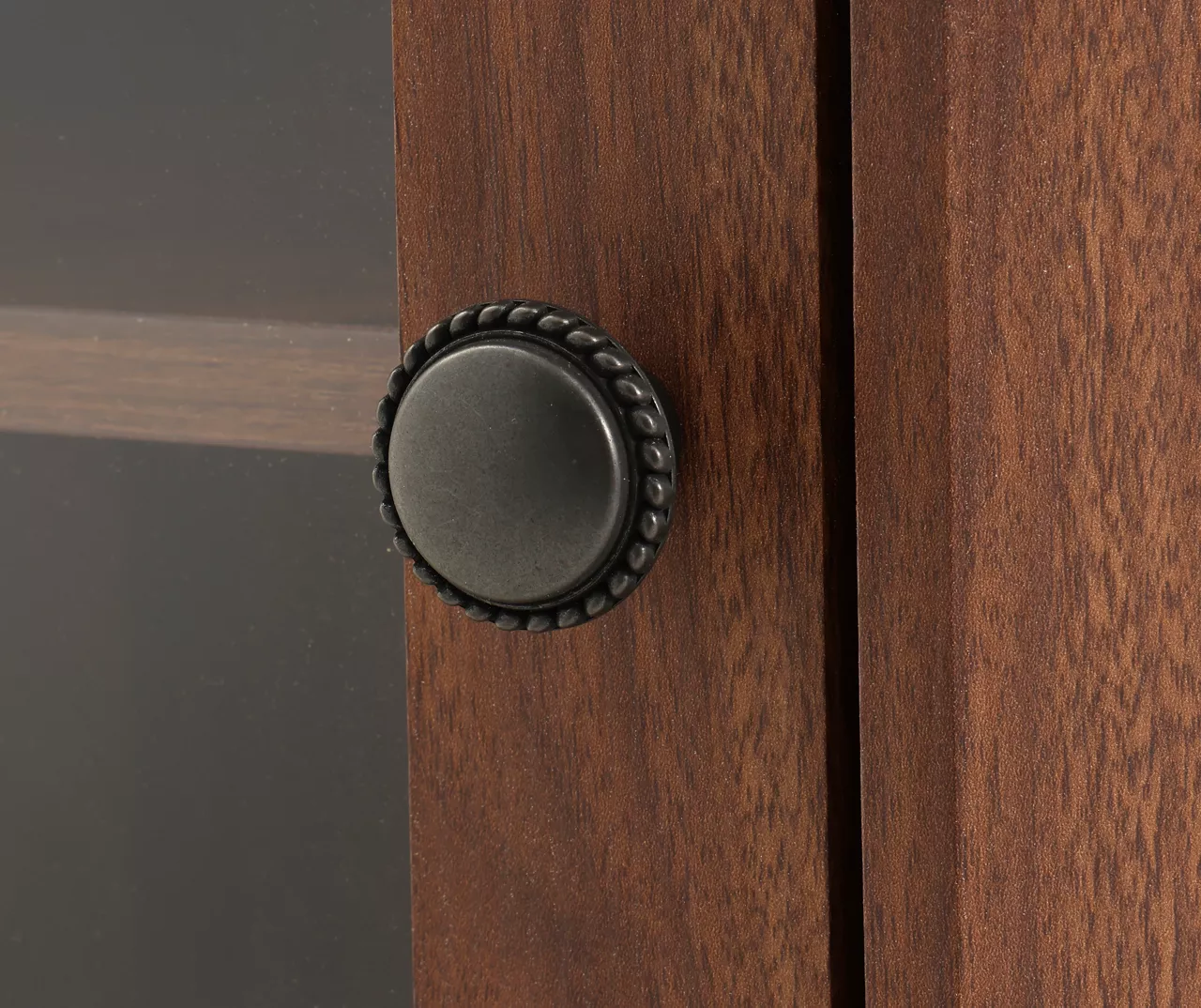 - Features 2 glass doors on either side with adjustable shelves for storage