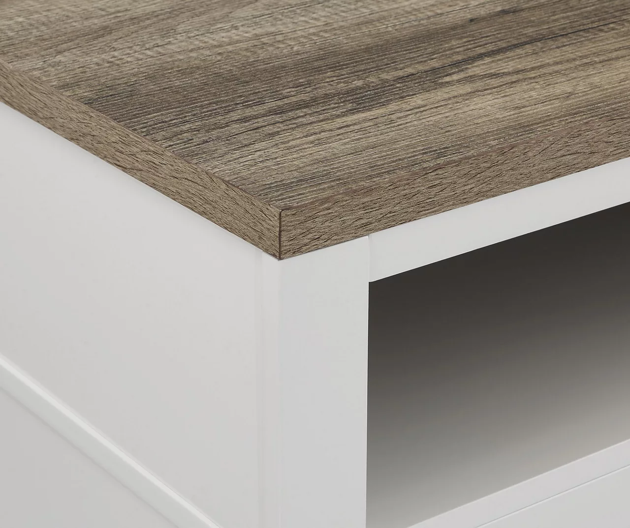 The Ameriwood Bridgeport electric fireplace and TV stand creates warmth and an inviting look in your living room or family area. This simple design features a 23” metal electric fireplace insert that keeps your room warm to create the perfect ambiance for the evening. The flames can be turned on with or without heat as the touch panel, remote control and LED bulbs provided you with many different settings to keep the mood and temperature just right. The beautiful white finish frame is accented by a medium brown woodgrain top with open and closed storage shelves to keep your entertainment components organized.