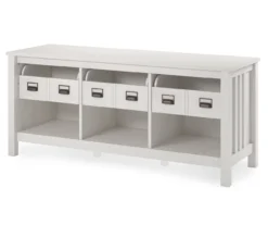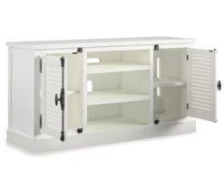 Versatile and beautiful, this highboy console will easily give any room in your home extra storage and flair. With a barn door style cabinet for concealed storage and spacious shelves to display your electronics or games, its asymmetrical design will complement your aesthetic while helping you organize your home in a way that feels just right. Woodgrain detailing featured on a durable laminate top, this TV stand is constructed with warp-resistant MDF. The modern farmhouse style of this entertainment center will give a rustic and charming accent to your living room while keeping your media and room essentials organized and neat.