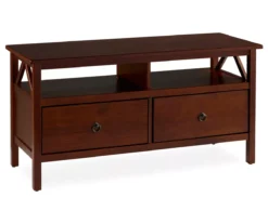 Part beach chic, part urban hip, the Neilsville TV stand is the finishing touch to your living room retreat, at a comfortably cool price. The rich brown butcher block finish over replicated pine grain lends a richly relaxed aesthetic that suits your sensibility. Open shelving and two smooth-gliding drawers bring an ideal amount of space to store all your tech accessories. Dark pewter-tone drawer pulls and metal legs add a high design element.