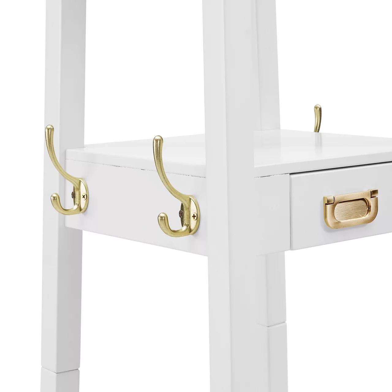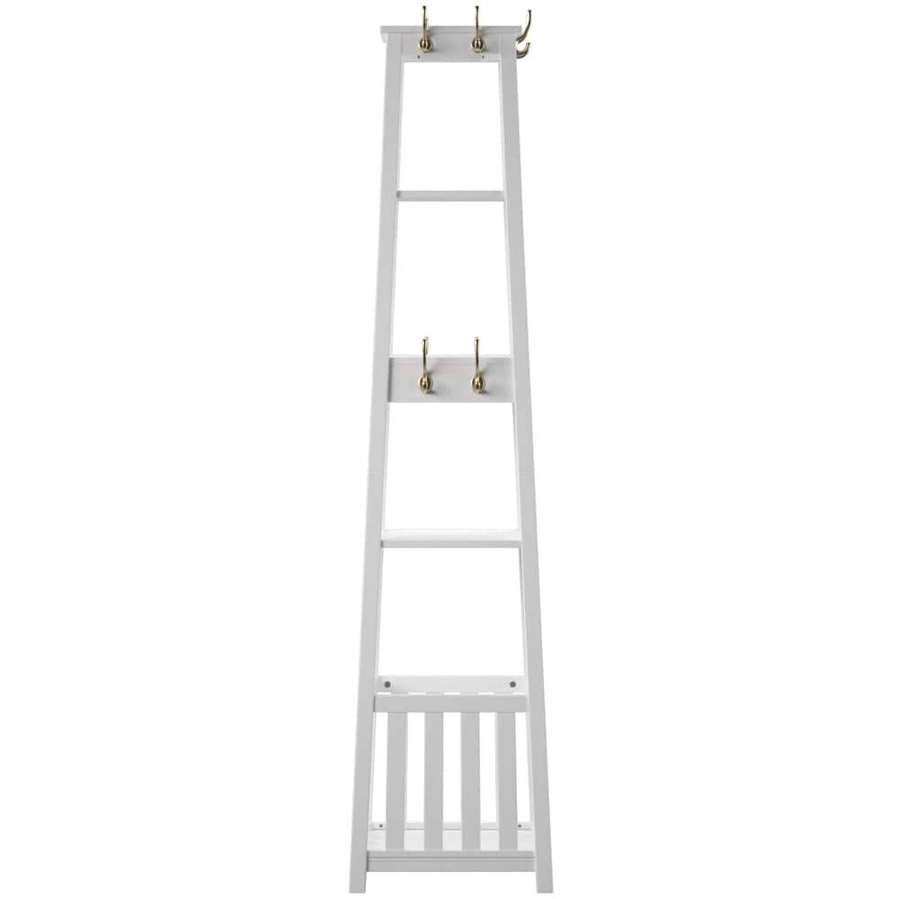 Refresh your home with this chic pyramid hall tree featuring sleek lines accented by rose gold hardware. The crisp white finish brightens the space while effortlessly complementing your existing color scheme. The tiered design adds ample space for decorative accents and storage totes while hooks and a bottom storage bin organizes coats, bags and outdoor gear.