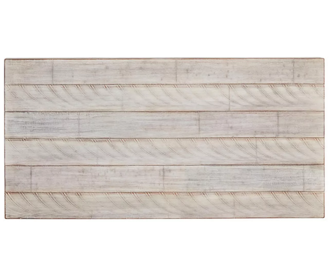 A rustic rendition of modern farmhouse style, this occasional table set is right in tune with your richly relaxed sense of style. The clean yet hearty profile is enhanced with a distressed whitewash finish and offset plank-effect tabletop. Decorative tension bar and nailhead accents add an industrial twist.