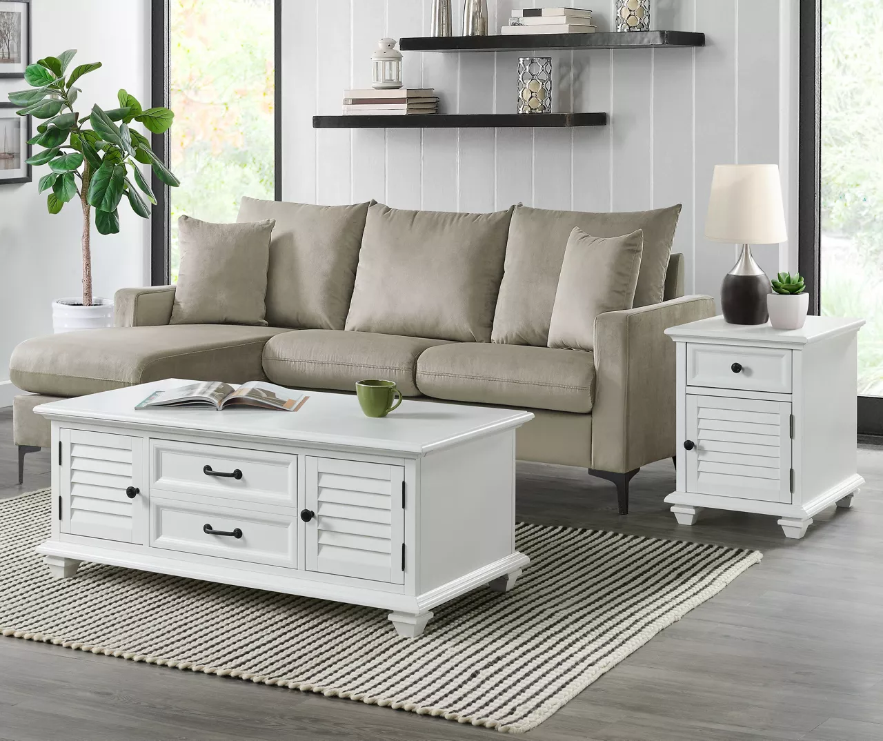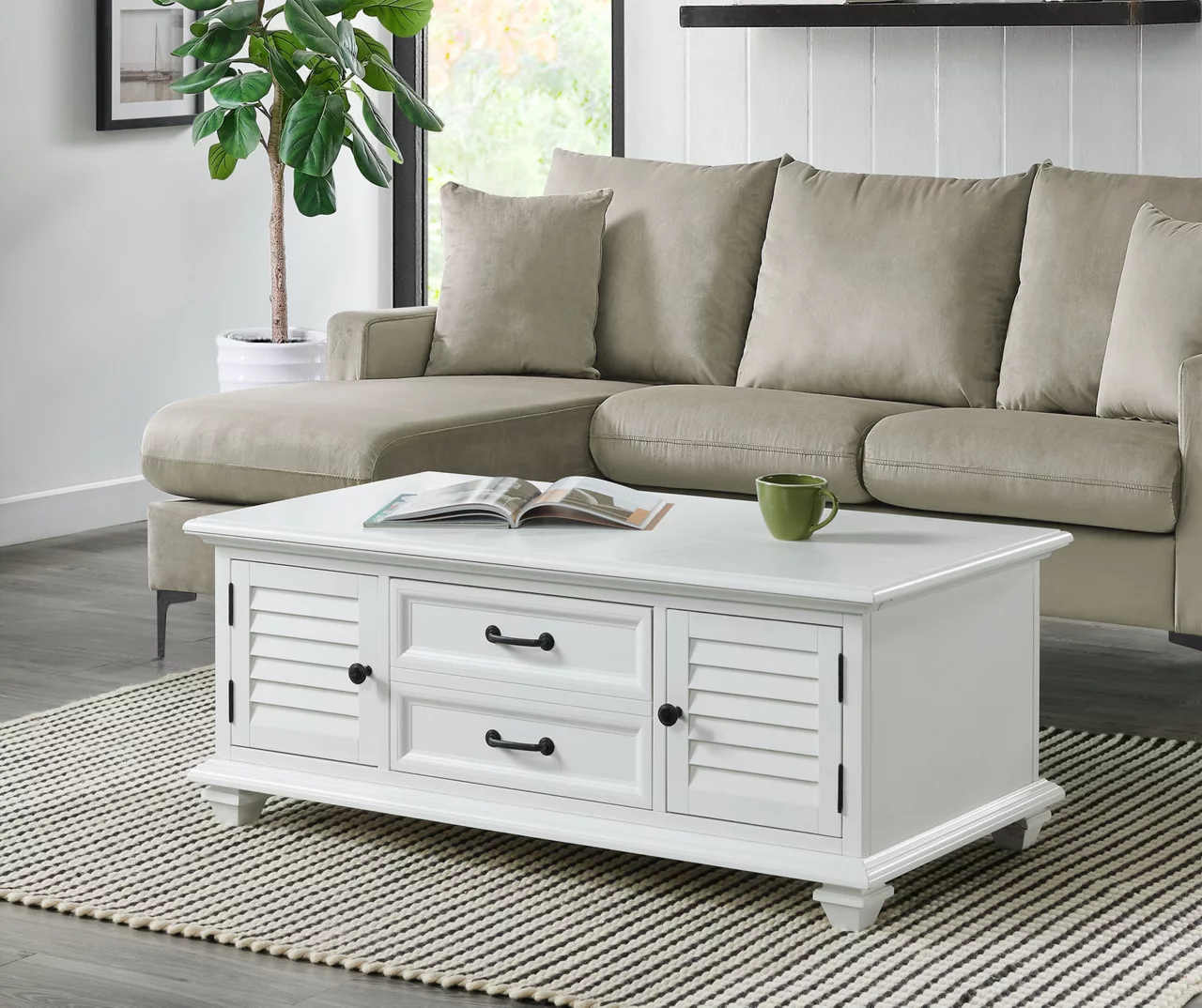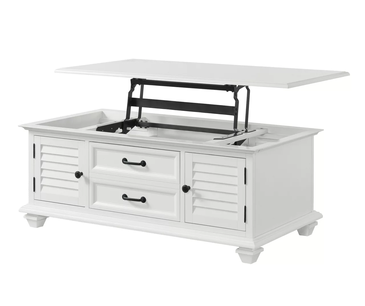 Elevate the look of any space with this Charleston coffee table from Broyhill. An elegant waxed white sapele veneer is featured on the top, base and shutter-style doors that contrast against the matte black finish hardware. Lifting the tabletop reveals hidden storage underneath for keeping remotes and accessories nearby as you use the combination of side cabinets and drawer for additional concealed storage.