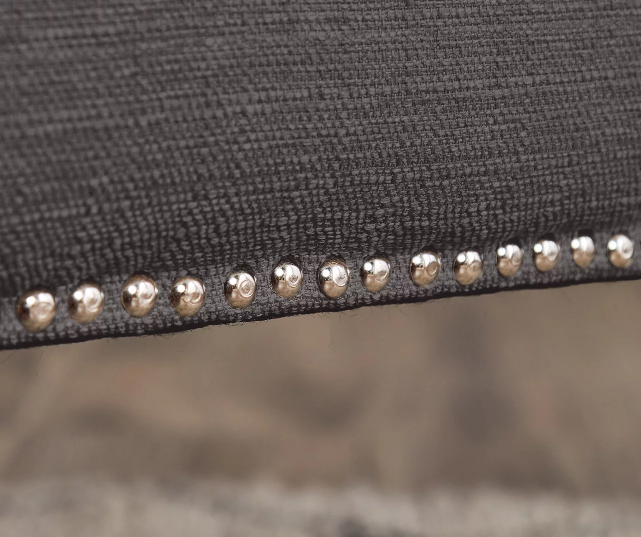 - Dark gray fabric desk chair with silver nail head trim