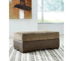 - Rectangular top is finished in a slightly textured, brown reclaimed wood-look laminate