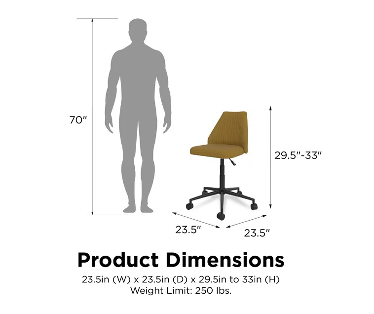 The Novogratz Brittany Office Chair with Casters is the ideal mix of modern and mid-century! Stuffed with comfortable foam cushioning, this armless chair delivers both style and flair. It has been crafted with a durable wood frame construction and rich linen upholstery. The Brittany features a ribbed tufted cushioned back with piping details and metal legs. Its iconic design provides ample back support to allow you to sit in complete comfort while working on your computer at your desk, reading the latest bestselling novel or catching up with the latest gossip on your tablet.