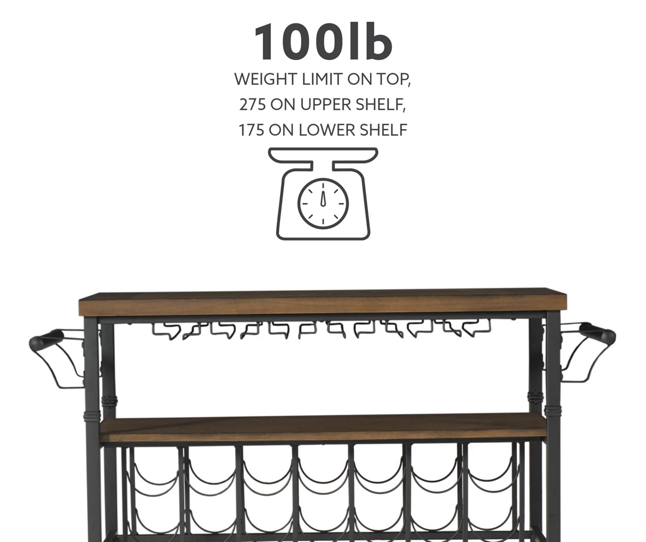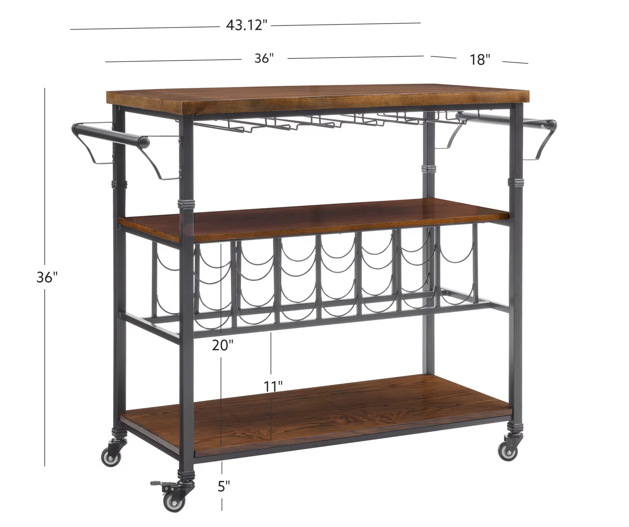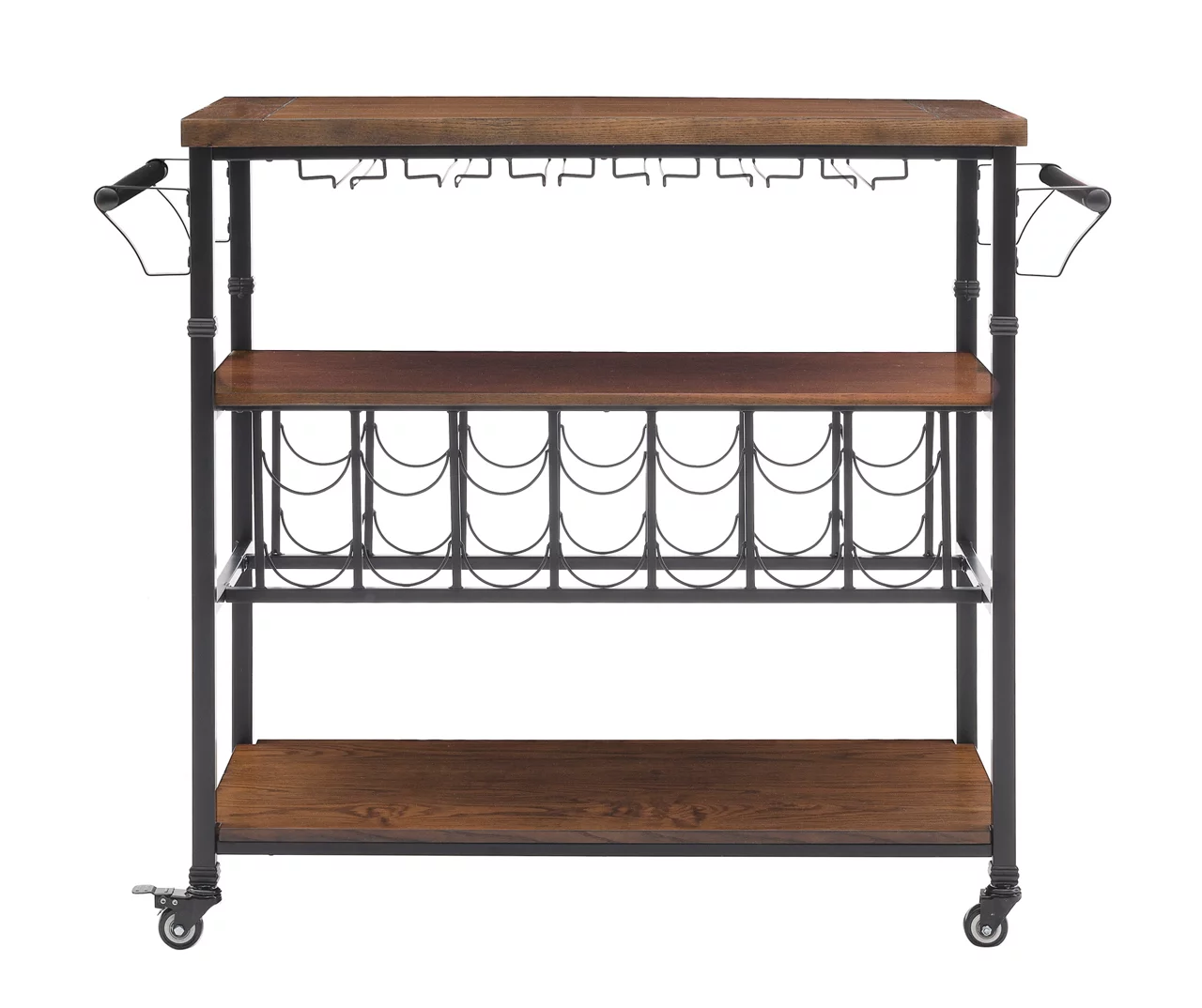 Become the entertainer of your dreams with this handsome wine cart! This classic piece makes mixing a cocktail or serving canapes a breeze while keeping wine bottles and wine glasses safe and conveniently close. Gather family and friends around this piece for a wine tasting as you showcase your skills as a sommelier or add this cart to a kitchen for added workspace and storage. In any setting, this cart offers rugged beauty and endless functions.