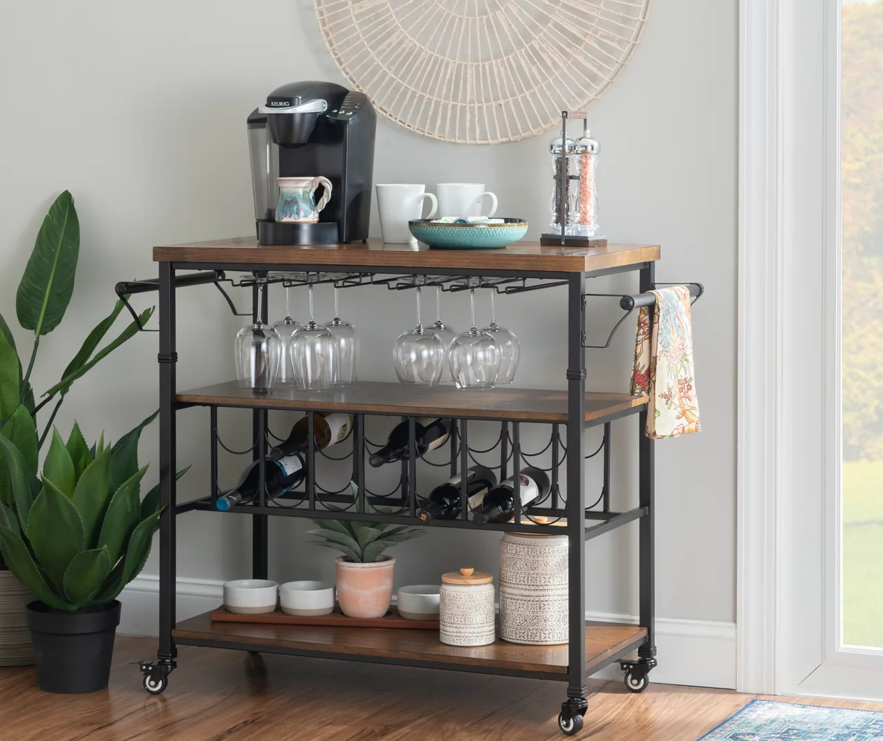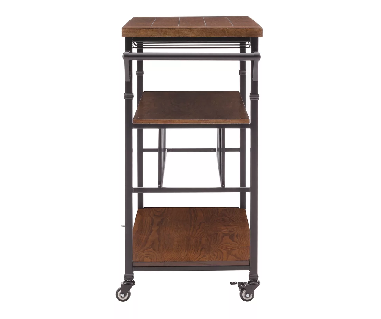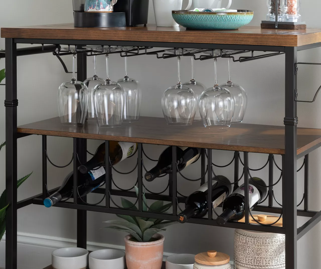 Become the entertainer of your dreams with this handsome wine cart! This classic piece makes mixing a cocktail or serving canapes a breeze while keeping wine bottles and wine glasses safe and conveniently close. Gather family and friends around this piece for a wine tasting as you showcase your skills as a sommelier or add this cart to a kitchen for added workspace and storage. In any setting, this cart offers rugged beauty and endless functions.