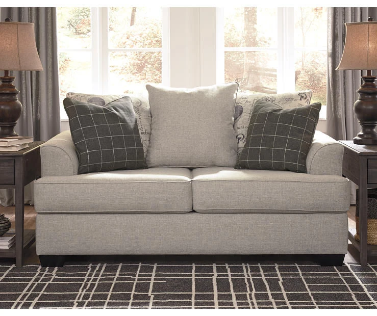 For the style enthusiast on a mission, the Velletri loveseat takes a unique approach to design. Two back cushions flaunt a vintage-inspired “Paris” script. Throw pillows continue the charm with gray-infused plaid patterns. Flared arms and neutral hue lend to transitional appeal. Covered in a luxurious linen-like chenille, its softness and luxurious comfort will keep you coming back.