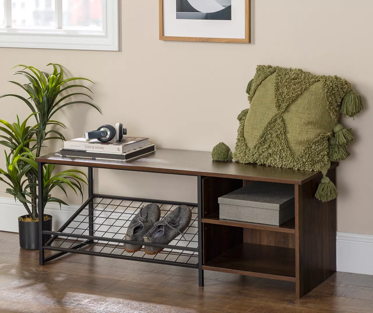 You’ll be putting your best foot forward when you place this entryway bench with a shoe rack at the entrance of your home. Not only does it have enough bench space to seat two adults comfortably, but it can also house several pairs of shoes thanks to the angled metal shoe rack and the adjustable storage shelf on one side of the unit. This industrial style storage bench is finished with a melamine coat to increase its durability and create a moisture resistant layer.