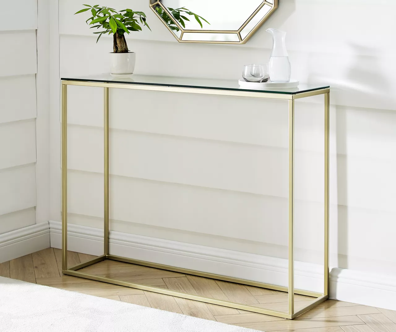 Admire this modern, open entry table as a staple piece to help organize your space. The smooth tabletop provides an easily-accessible surface for keys, bags, and other work necessities as you head out the door. Enhance your home decor with the sophisticated, painted metal legs and two-tone look. The open box style offers extra storage for books or baskets of toys when the table is placed behind the sofa or in the hallway.